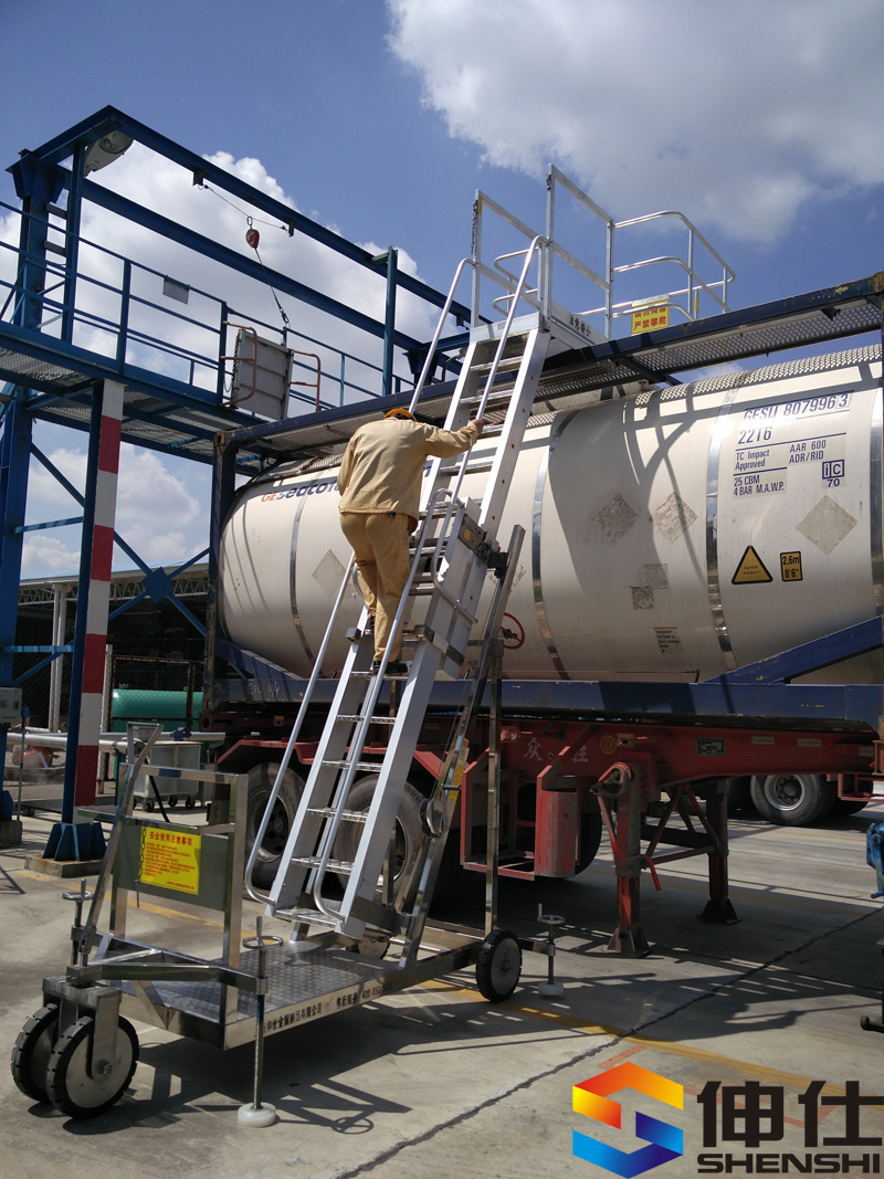 取樣梯 主體結構底盤為碳鋼或不銹鋼材質,碳鋼表面靜電噴涂烤漆,爬梯部件為高強度鋁合金。